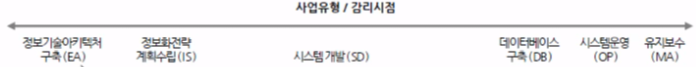 정보기술아키텍처 구축 사업, 정보화전략계획수립 사업, 시스템 개발 사업 (구조적/정보공학, 객체지향/CBD), DB 구축,시스템 운영, 유지보수 사업별로 구성되어 있음