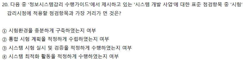| 시험활동 | 시험환경을 충분하게 구축하였는지 여부 통합시험 실시 및 검증을 적정하게 수행하였는지 여부 시스템 시험 실시 및 검증을 적정하게 수행하였는지 여부 시험결과의 관리 및 개선을 적정하게 수행하였는지 여부 시스템 최적화 활동을 적정하게 수행하였는지 여부 사용자 운영자 지침서를 적정하게 작성하였는지 여부 사용자 인수시험 계획을 적정하게 수립하였는지 여부 |