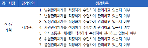 감리시점 : 1.분석 -> 2.설계 -> 3.구현 -> 4.시험 -> 5.전개
