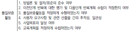 | 품질보증활동 | 방법론, 절차, 표준 수립 및 준수 여부 품질보증활동 계획 수립과 활동결과가 적정한지 여부 사용자요구사항과 관련 산출물 간의 추적성, 일관성 교육 및 훈련 계획의 적정성 여부 |