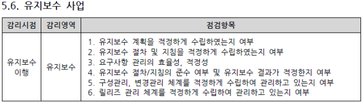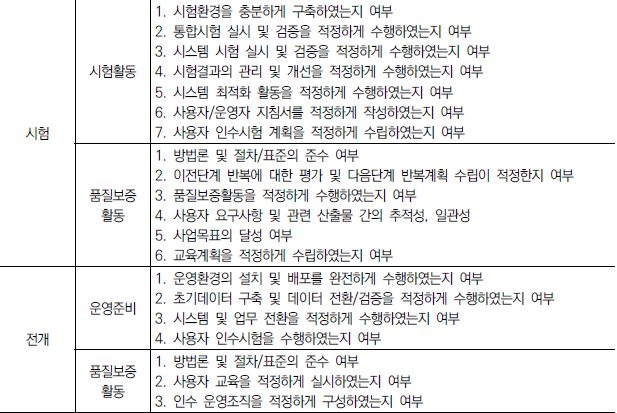 | 운영준비 | 1. 운영환경의 설치 및 배포를 완전하게 수행하였는지 여부 2. 초기데이터 구축 및 데이터 전환/검증을 적정하게 수행하였는지 여부 3. 시스템 및 업무 전환을 적정하게 수행하였는지 여부 4. 사용자 인수시험을 수행하였는지 여부 |
