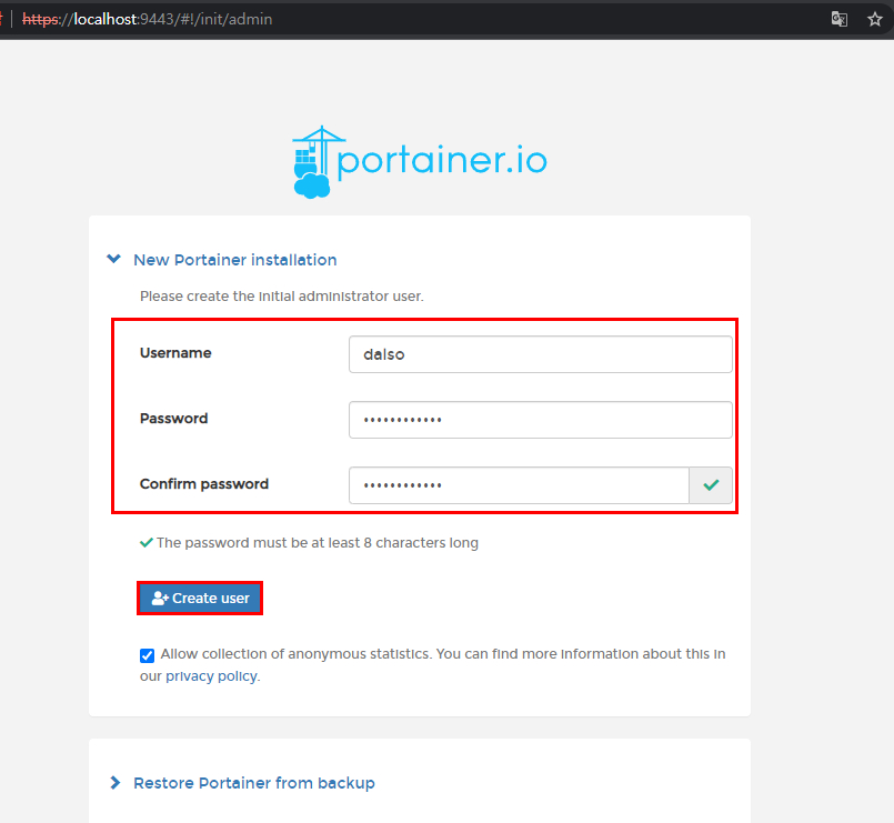 도커 컨테이너 생성명령어는 아래와같습니다. 여기서 8000 포트는 에이전트 관리용, 9443은 웹 접근용입니다.