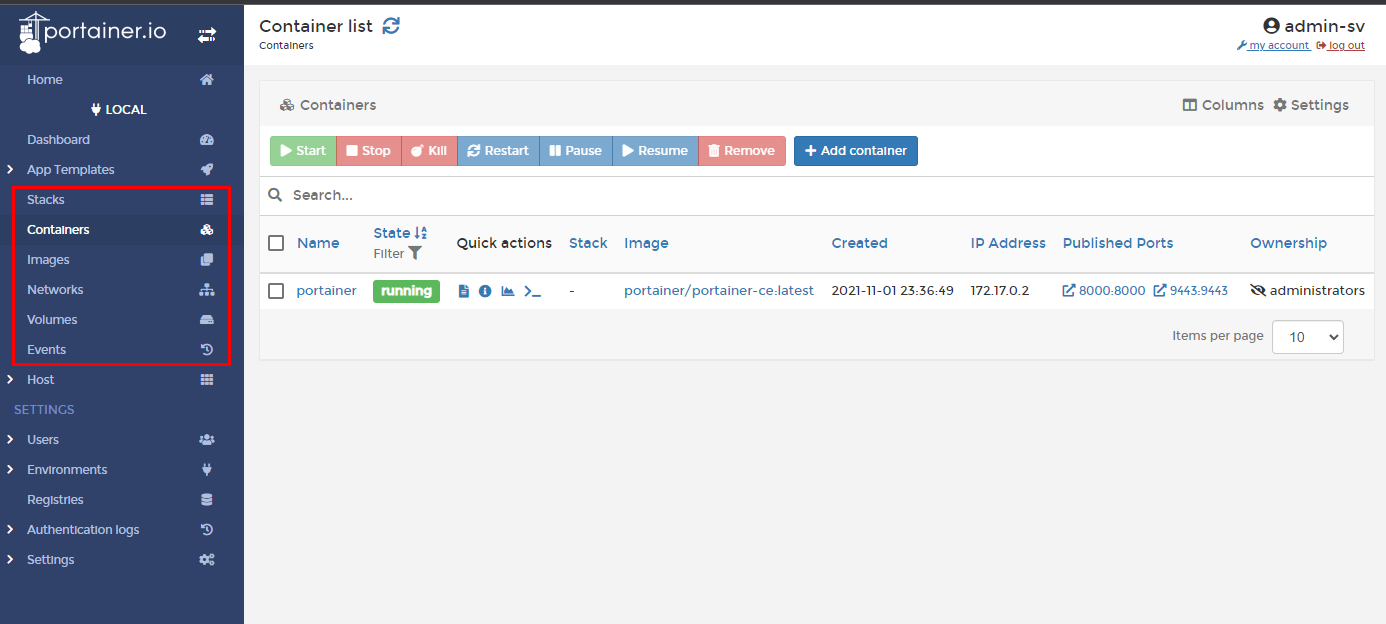 관리자용 계정을 만들어주고 난뒤 Get Started 를 누르면 현재 설치되어있는 Docker 환경을 볼 수 있습니다.