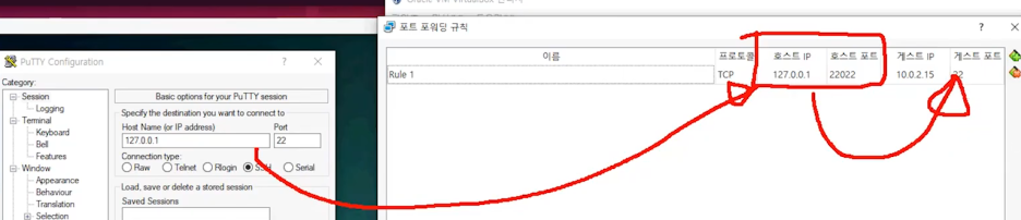 버추얼 박스 포트 포워딩 규칙에 설정한