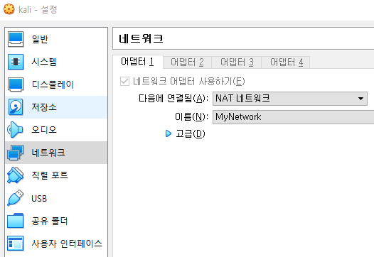 네트워크 > 네트워크 방식을 'NAT 네트워크 선택'