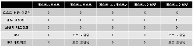 버추얼박스에서 제공하는 네트워크의 옵션 별 기능은 다음 표를 참고한다.