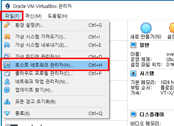 Virtual Box 관리자 창에서 [파일] → [호스트 네트워크 관리자]를 엽니다.