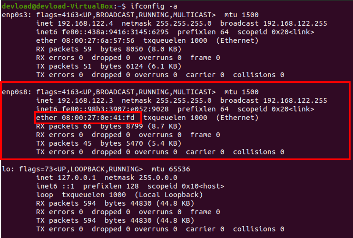 여기서 두 번째 빨간색으로 표시한 MAC 주소를 잘 기억합니다.