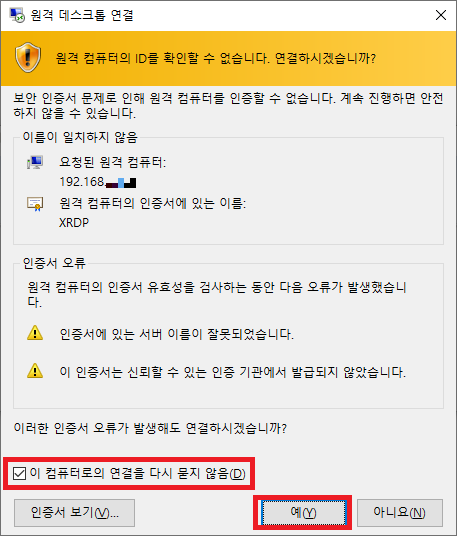 xrdp의 인증서 관련 알림 창이 발생한다. 추후 같은 알림 창이 발생하지 않도록 다시 묻지 않음을 클릭하고 예를 클릭한다.
