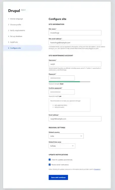 Next, you will be taken to the Drupal configuration page. Fill in the site name, email, username, password, and regional settings. Click the Save and continue button once you are finished.