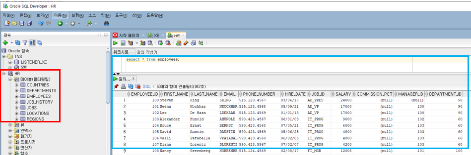 접속해보면 요렇게 HR데이터베이스가 생겼고 그 아래 테이블 목록에 설치한 테이블들이 제대로 뜨는 것을 확인할 수 있어요.