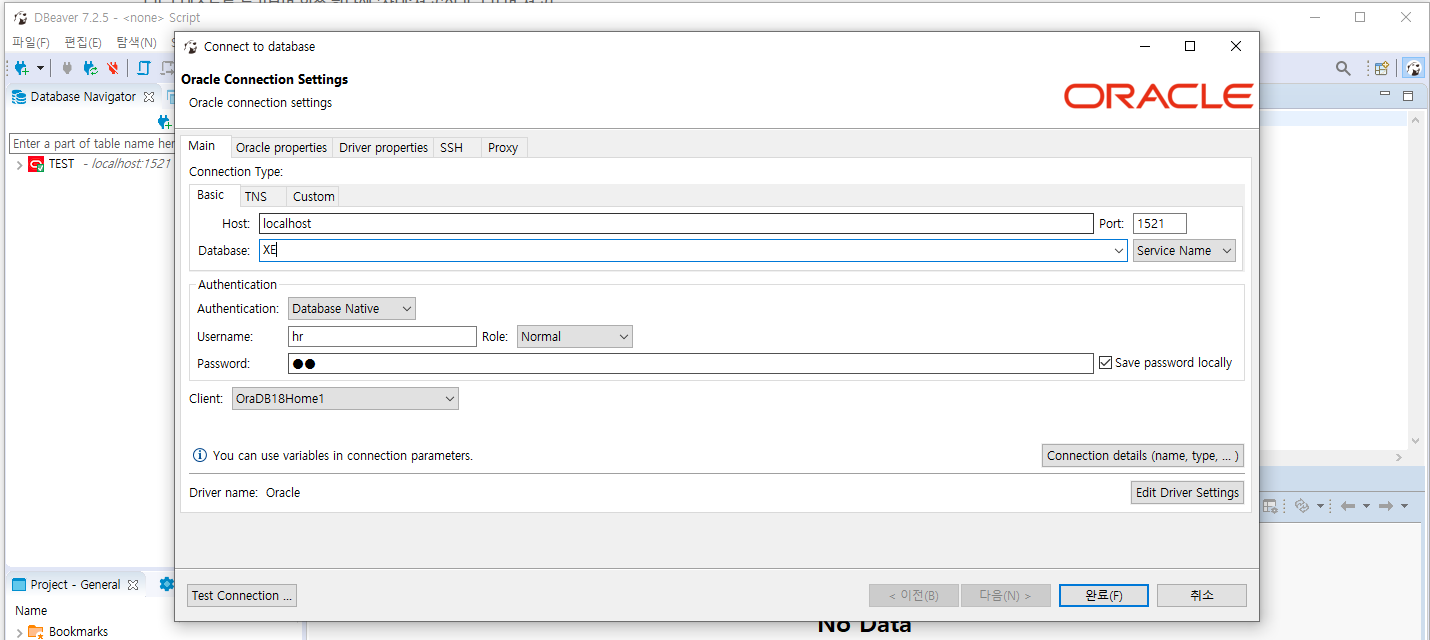 DBeaver에서도 또한 오라클로 커넥션을 생성한 뒤, 정보란 username을 hr로 Password를 hr로 써주세요~