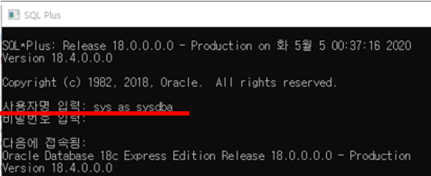 sys as sysdba를 쳐서 관리자로 로그인해주세요. (비밀번호는 저의 경우 root로 설정해뒀었는데, system계정 비밀번호를 입력하면 됩니다)