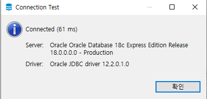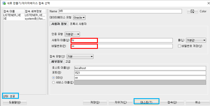 사용자 hr 비밀번호 아까 입력했던 비밀번호를 쳐줍시다. (저의 경우 동일하게 hr로 함)