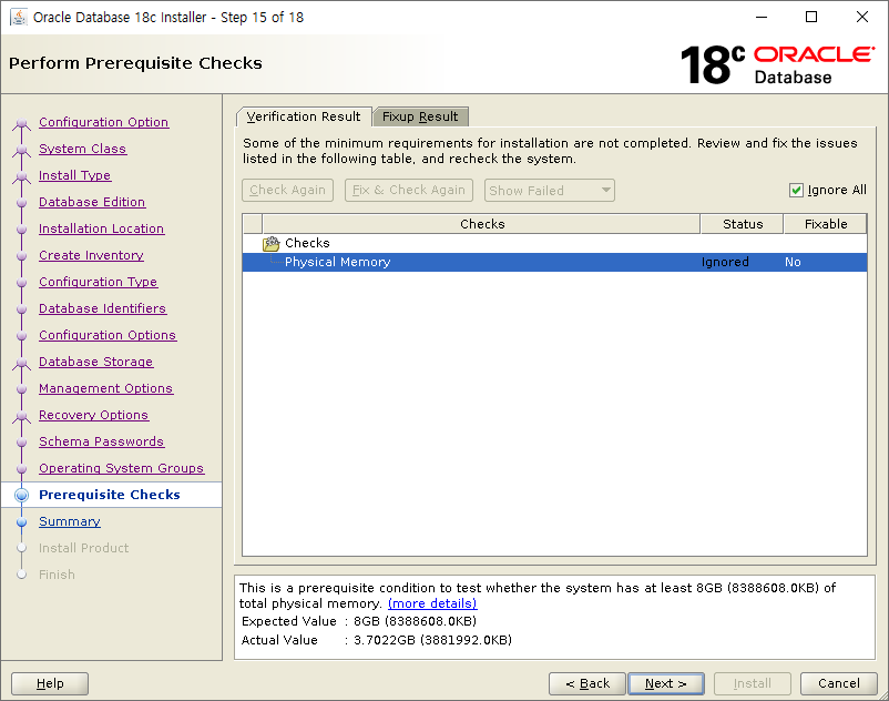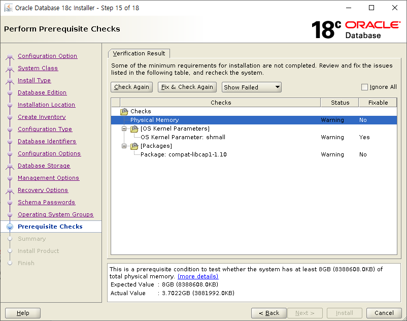 OS Kernel Paramete: shmall - 상단 중앙에 Fix & check again을 클릭하고 스크립트 실행