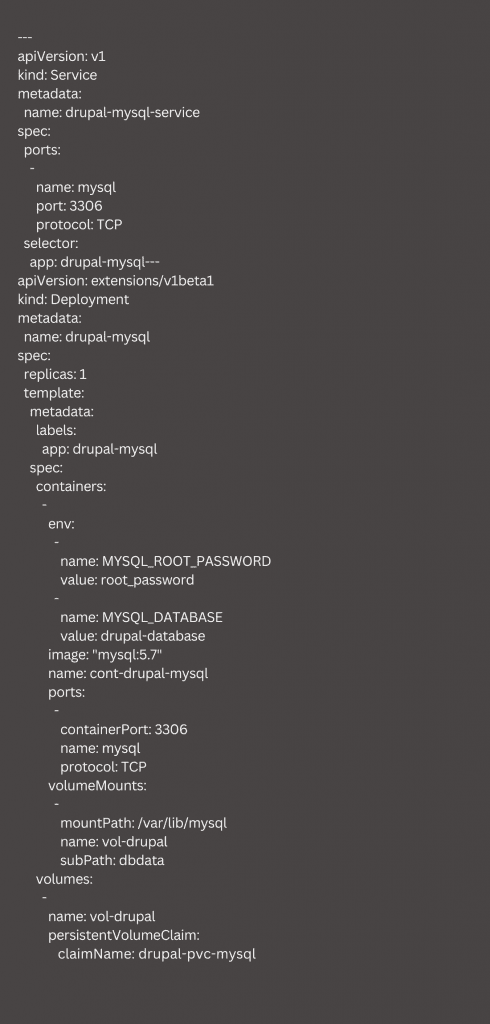 In order to deploy the MySQL instance we need a Deployment and a Service. We also need to run MySQL from the root. Our experts recommend using custom credentials. Then create the file drupal-mysql.yaml