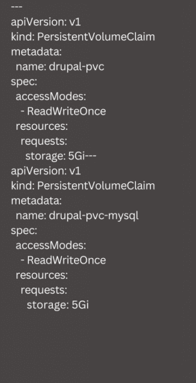 Next, we have to create a PersistentVolumeClaim by creating drupal-persistentvolumeclaim.yaml as seen here: