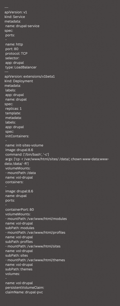 The Deployment is based on a container with a Drupal image from the Docker Hub repository. Furthermore, we will use a container (InitContainer) to pre-populate the persistent storage with the data used by Drupal. To do this, we have to create drupal.yaml file: