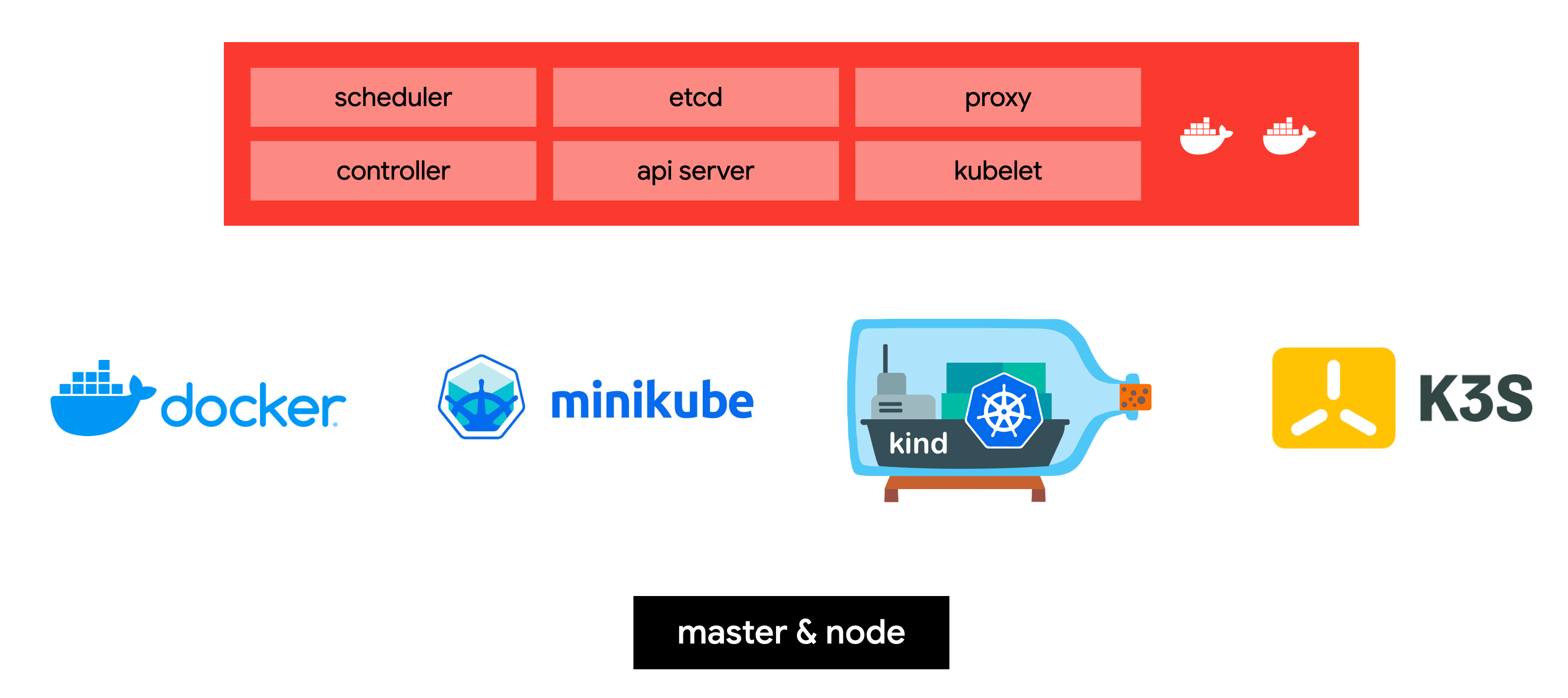 대표적인 개발 환경 구축 방법으로 minikube, k3s, docker for desktop, kind가 있습니다.