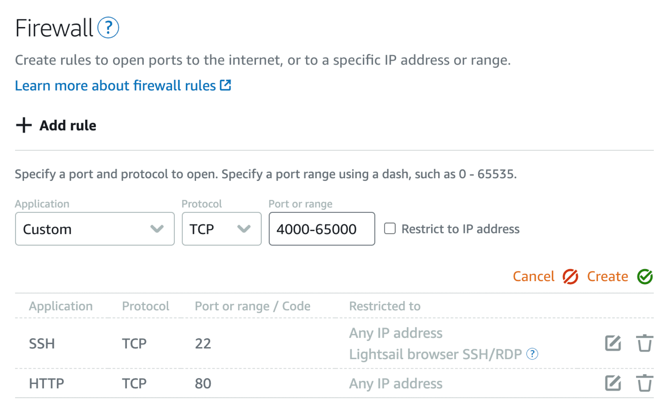 - Networking 탭 선택후 방화벽 허용 (4000-65000) SSH(22)는 반드시 제거