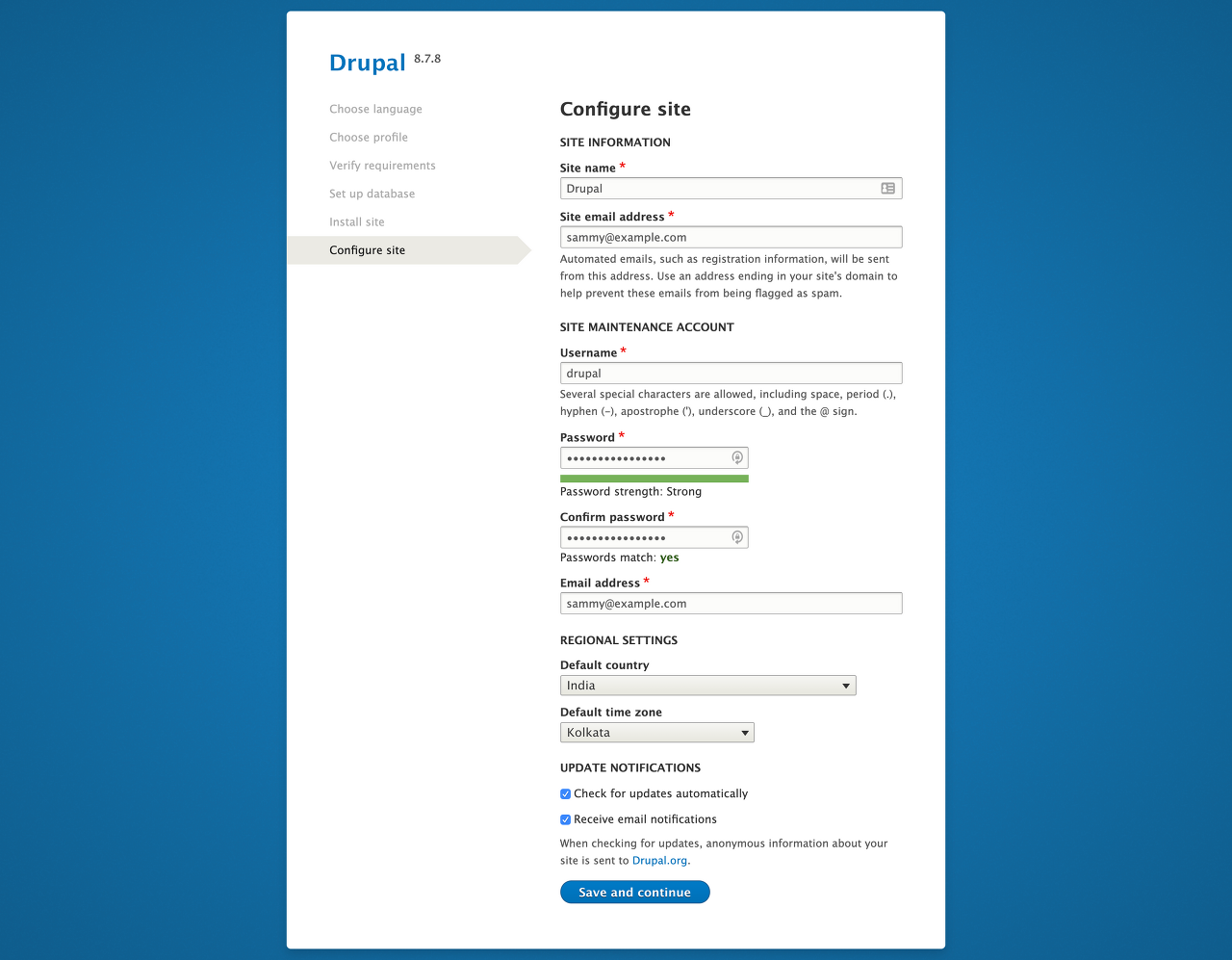 Once the site is installed, we will land on the Drupal site setup page for configuring the site name, email, username, password, and regional settings. Fill in the information and click on Save and continue: