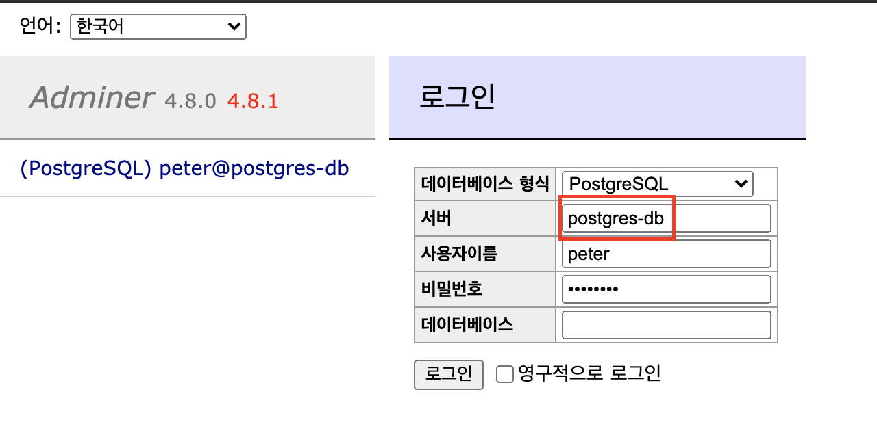 localhost:8080으로 adminer에 접속하여 postgresql-db에 접속할 수 있습니다.