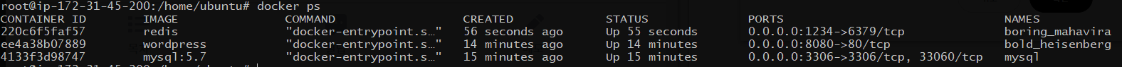 docker ps를 실행해보면 다음과 같이 실행중인 컨테이너가 뜹니다. names는 직접 --name 옵션을 준 경우에는 해당 이름으로 뜨지만 생략한 경우 랜덤한 이름이 부여됩니다. 아래 출력에서는 borring_mahavirra, bold_heisenberg가 떴네요.