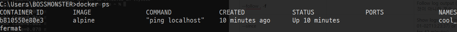 | --follow , -f | Follow log output (한번 출력하고 마는 것이 아니라 계속 watch함) | |
