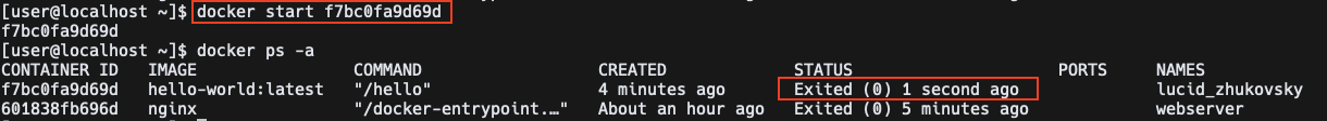 docker (container) start [옵션] <컨테이너 식별자> [컨테이너 식별자]