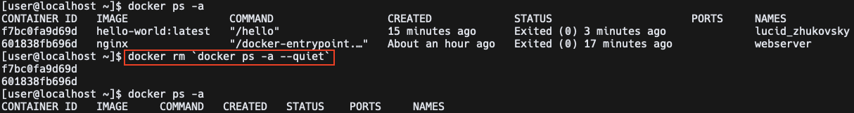 - docker rm `docker ps -a --quiet` : 도커 컨테이너 전부 삭제