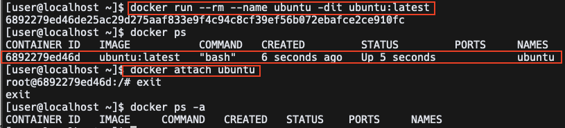 - docker attach ubuntu 명령어로 ubuntu 컨테이너에 attach 가능