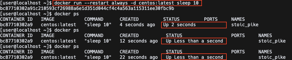 - on-failure:횟수n : 종료 status가 0이 아닐 때 n번 재시작한다