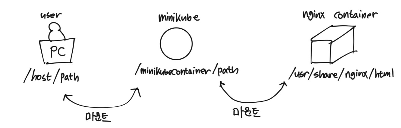 minikube를 실행할 때 로컬의 /host/path 와 minikube 컨테이너의 /minikubeContainer/path 가 마운트되어 폴더가 공유되어진다.