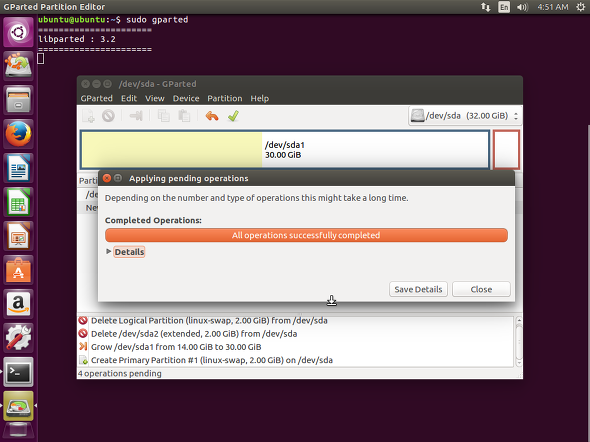 32GB는 고정된 값으로 실제 리눅스에서 사용하는 /dev/sda1에 대해서 30GB로 늘려주었다.