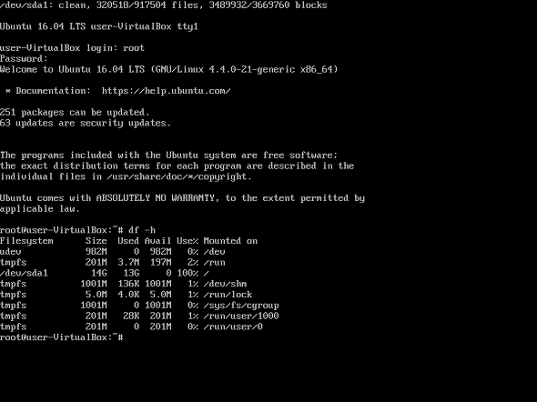 사용할 수 있는 공간이 없어서인지 X window에서 terminal도 실행이 안되고 해서 console로 진입해 용량을 확인해 보았다. 용량 확인을 위해 df -h를 해보니 /dev/sda1 에서 Avail이 0으로 되어 있고 Use%가 100%로 바닥나버렸다.