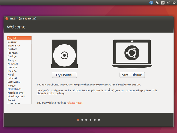 CD(ISO)로 부팅하면 그냥 Live로 Ubuntu를 사용할 것인지 아니면 설치할 것인지 선택하는데 이번에는 설치하는 것이 아니기 때문에 "Try Ubuntu"를 선택한다.