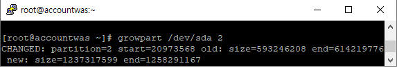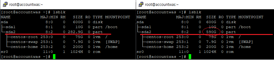 * 추가한 300GB 용량이 sda2에 정상적으로 배정 된 것을 알 수 있다.