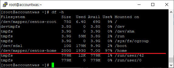 현재 확장하고자 하는 /home 디렉토리는 용량은 sda2의 centos-home 공간으로 배정된 것을 확인 할 수 있다.