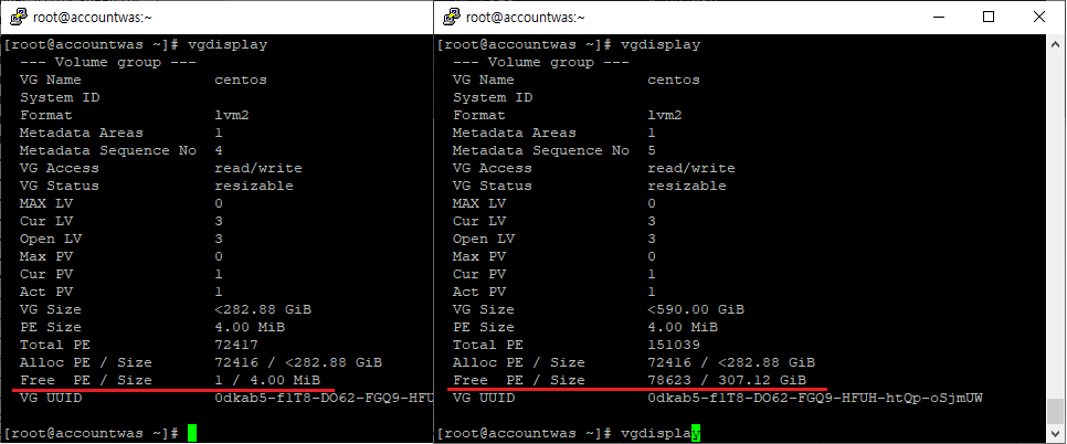 명령어 수행시 위와 같이 현재 총 볼륨그룹 (VG)의 총 사이즈 , 할당 사이즈, 여유 사이즈 등을 확인 할 수 있다.