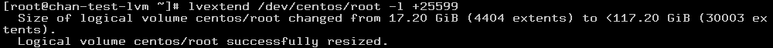 # lvextend /dev/centos/root -l +25599