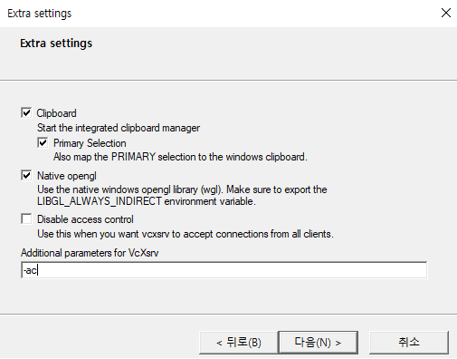 Additional parameters for Vcsrv에 '-ac'를 입력합니다.