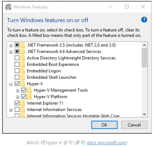 또 다른 예로, Microsoft Hyper-V 의 경우 OS 를 설치하면 기본으로 제공되기 때문에 Hyper-V 다운로드가 필요하지는 않고 해당 옵션을 활성화시키는 방식으로 사용할 수 있습니다.