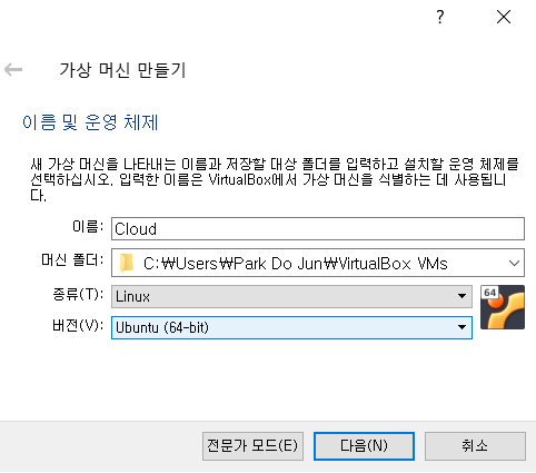 virtualbox를 설치하고, (데스크탑 모드여서 그냥 화면 보고 설치했다.)