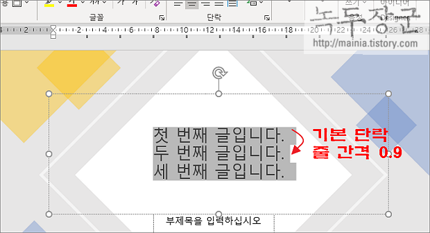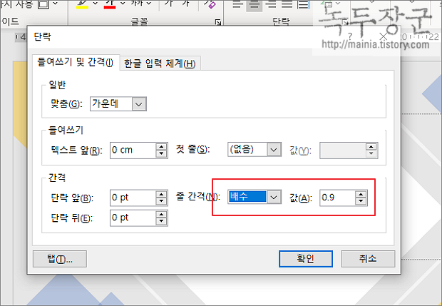 ▼ 기본 파워포인트의 단락간 줄간격은 배수로 해서 0.9 입니다. 너무 붙어 있다는 느낌이 듭니다. 좀더 간격을 넓혀 보겠습니다.