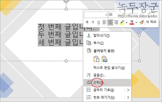 ▼ 좀더 디테일하게 수정하는 방법입니다. 줄 간격을 적용할 영역을 선택하고 오른쪽 마우스를 누릅니다. 메뉴 목록에서 단락 을 선택합니다.