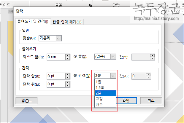 ▼ 단락 옵션에서 선택한 2줄은 "선 및 단락간격" 리본 메뉴에서 선택한 2.0 과 같습니다.