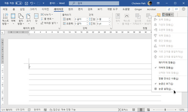 가로선, 세로선을 모두 나타나게 하거나 선 간격을 원하는 대로 조정하고 싶다면, [레이아웃] > [맞춤] > [눈금 설정] 메뉴를 이용한다.