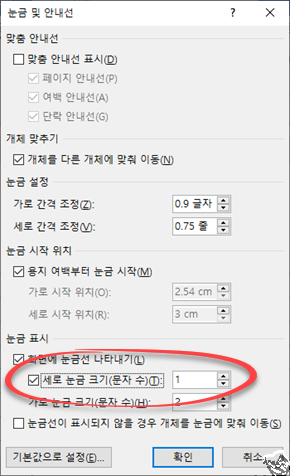'세로 눈금 크기(문자 수)' 항목을 선택하고 [확인]을 누른다. 이렇게 하면 모눈종이와 같은 형태로 눈금선을 볼 수 있다.