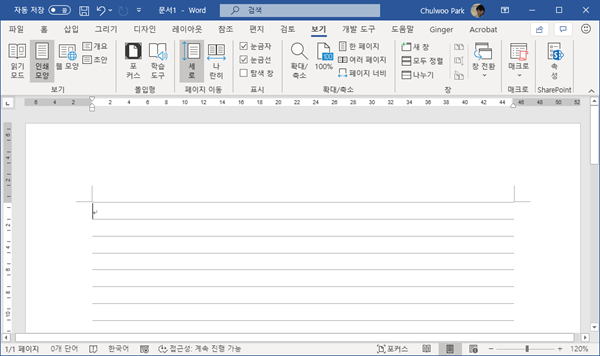 [보기] 메뉴에서 [눈금선]을 선택하면 일반 노트처럼 가로줄이 일정 간격으로 나타난다.