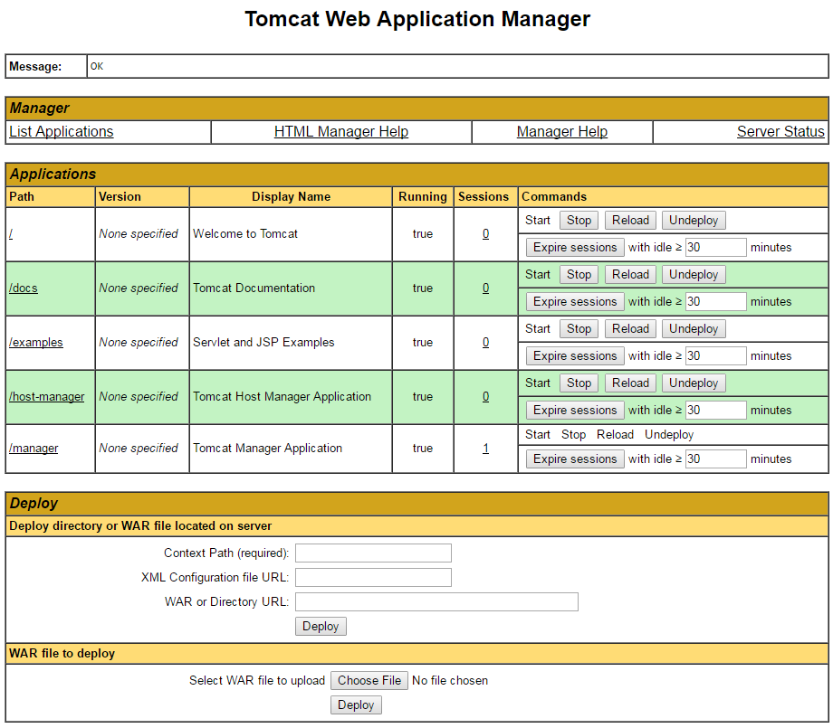 Let's take a look at the Manager App, accessible via the link or http://servername:8080/manager/html